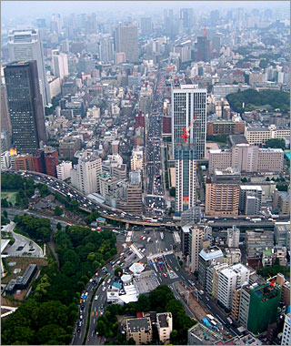まだ明るい時間に写したタワー真下の道路。人のように見えるせいか?大動脈って言葉がしっくりくるね |