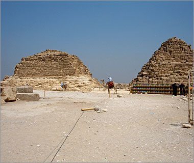 エジプト王国の国力がだいぶ衰えてから作られたメンカウラー王のピラミッド。拍子抜けするほど小さいです。クフに憧れ続けてピラミッドを作らずにいられなかった王ですが、無理して作っちゃった感が漂うね〜(寂) |