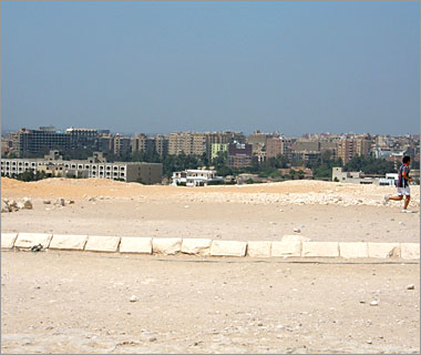 っとか何とか考えながら後ろを振り返ると、これだもんねぇ〜(泣)。ギザのピラミッドのまん前はマンションが林立してます。だからサッカラの方が数倍よかったって… |
