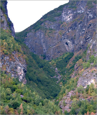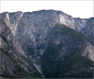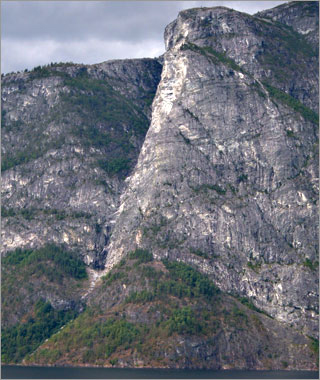 ここへ来る前に見た「ハダンゲル・フィヨルド」が穏やかで”女性的”と表現されるのに対し、ここ「ソグネ・フィヨルド」は風景の荒々しさから”男性的”と表現されることが多い。成る程という印象。にしても凄い高度感だ。。 |
