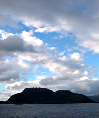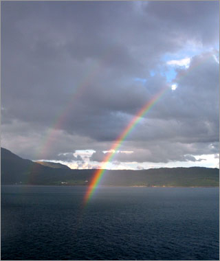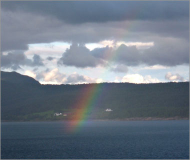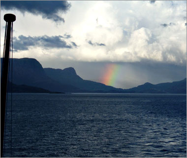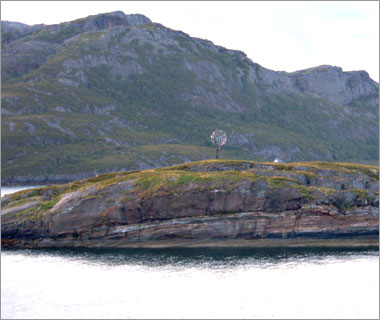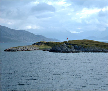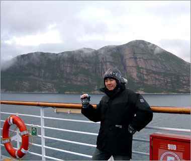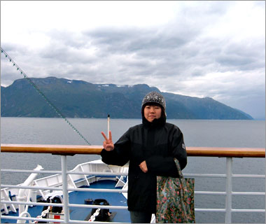 フィヨルドを抜けたあたり。この帽子が手袋とセット柄で買ったベルゲンでみやげ☆ |