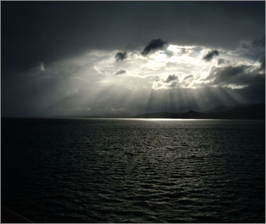 ゆっくりと、白く光り輝く不思議な岩山が見えてくる…。 |