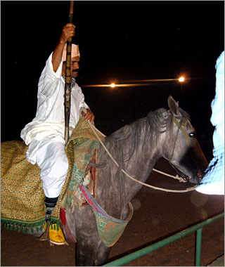 ツアーの最後に連れて行かれたイベント・レストラン?でやってた騎馬ショー。わっくわくして見に行ったのに、このアラブ風オッサン+馬が10頭くらいダカダカダカ〜と駆けてきてドン!と一発鉄砲撃って終わり。…って、そんだけかぁ!!?(呆) |
