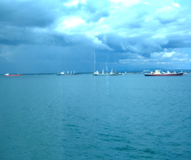 これから南北アメリカ大陸を貫くパナマ運河を通過する。スエズの時と同じく、運河の入り口では前夜のうちから大型船舶が何隻も連なって順番待ち。 |