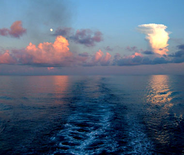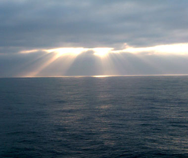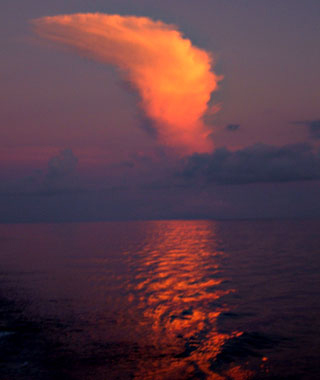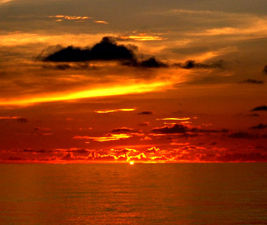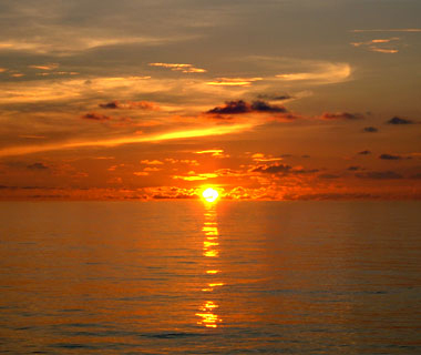 三ヶ月も海の上にいても、案外1〜2度しかちゃんとは見られない、海面に沈む夕日。 |