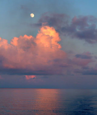 この夕焼けと月を見ているのもこの海に自分達だけ。 |