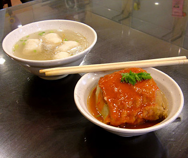 なるべくキレイそうな食堂で食べた「アーゲー」という食べ物。(右)ルーツは日本らしい?左は魚のすり身ダンゴ汁「魚丸湯」 |