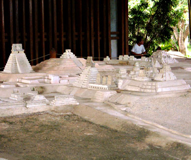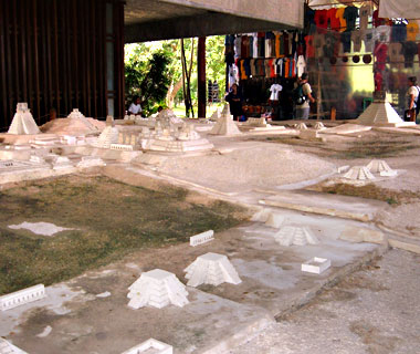 広大な範囲にわたっててジャングルの中に点在してる遺跡群を、まずは模型で予習だ〜!むこうに鮮やかな色のTシャツやら民族衣装のおみやげが見える。 |