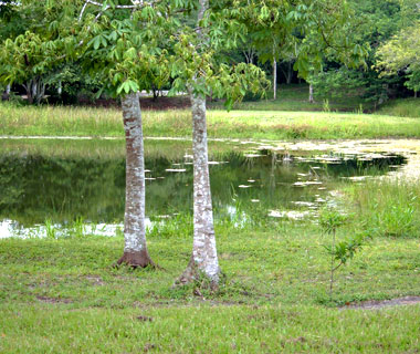 ジャングル遺跡探検に出発!この水たまり?は人造のため池だと言ってたような。マヤ文明は歴史上は非常に珍しく、大河のほとりとかではなく密林の中で高度に発達した文明。ゆえに水資源の確保には多大な知恵と労力を使っていた。 |