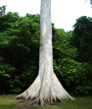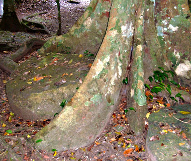 これは「板根」という、熱帯とかに特有の樹木の根っこ構造。意外と熱帯林というのは土地が痩せてて土壌が薄いので、こうして広い面積で長大な幹を支えてるのだ。 |