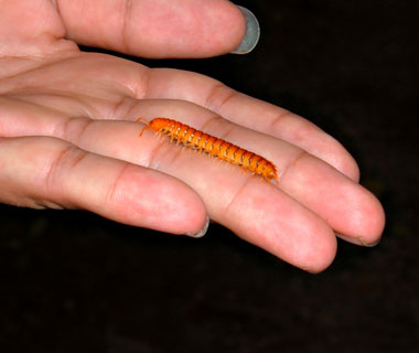 熱帯林ではイモ虫までが派手なオレンジ色だ〜。 |